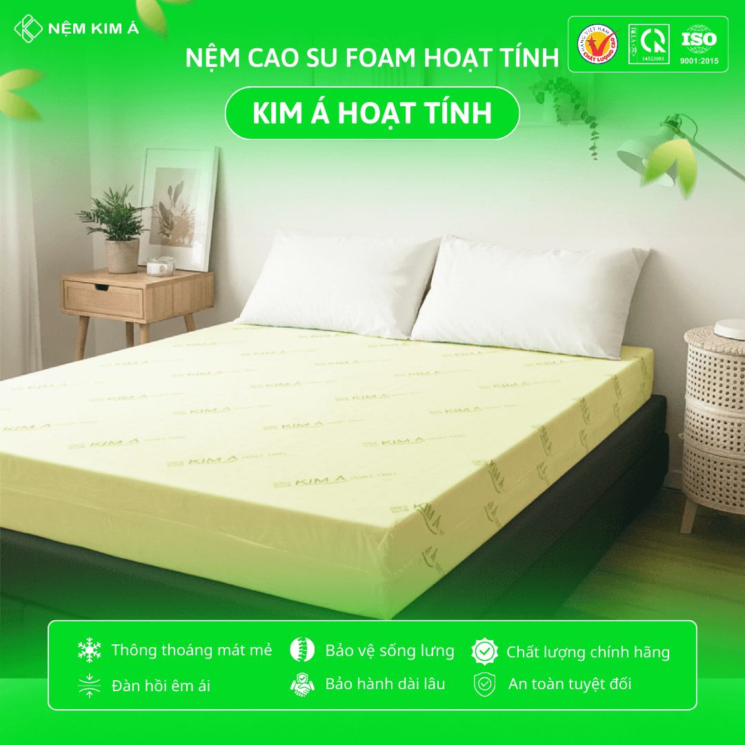 Nệm KIM Á hoạt tính là sự kết hợp hoàn hảo giữa foam và than hoạt tính tăng khả năng khán khuẩn chống ẩm mốc và khử mùi hôi.